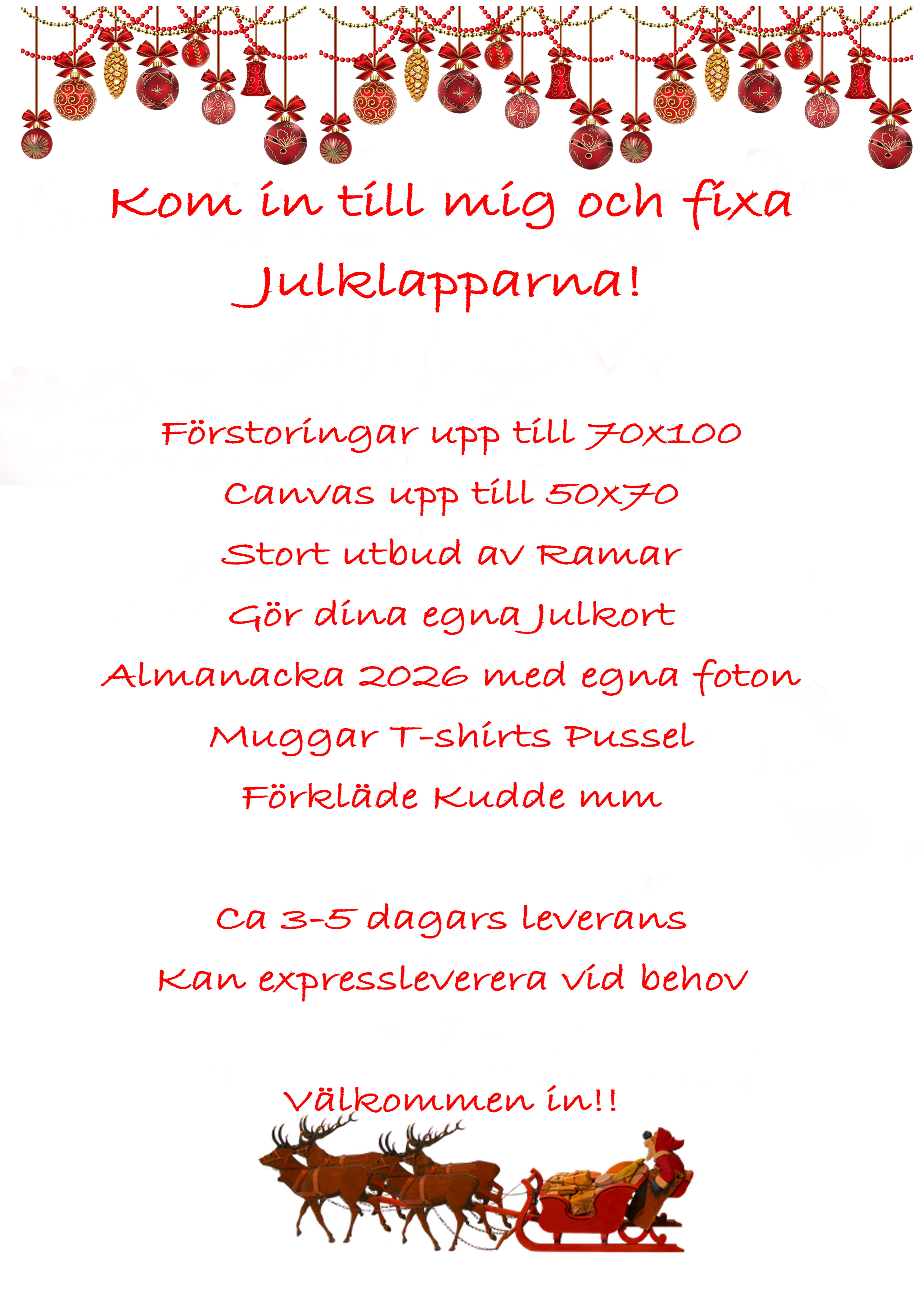 Vi framkallar “vanliga” rullar samt allt inom digitalt foto. Storlekar från 10X14 upp till 70×100 görs i butiken. Och Du kan själv beställa dina bilder via vår fotokiosk eller hemsida.